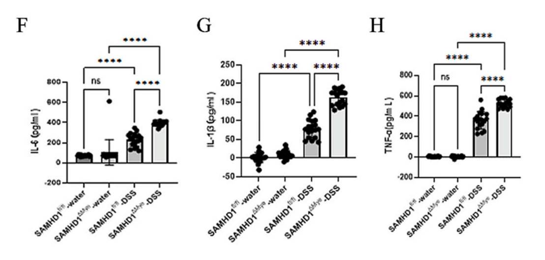 5. 试剂盒中的终止液是酸性溶液,使用时请做好眼镜、手、面部及衣服的防护。研究领域 研究领域 Drug DiscoverySmall Molecule DrugLead Compound Discovery实验结果图(F-H) ELISA analysis of inflammatory cytokines IL-6, IL-1β, and TNF-α in colon tissues; cytokine levels were significantly elevated in SAMHD1ΔMye-DSS mice.温馨提示:本产品仅作科研实验使用,不支持临床等研究