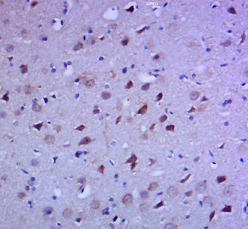 概述 别名 IL-1 β抗体;Catabolin; H1; IL-1β; Hematopoietin 1; IFN beta inducing factor; IL 1; IL 1 beta; IL 1B; IL1B; IL1F2; Interleukin 1 beta; Interleukin 1 beta precursor; LAF; OAF; Osteoclast activating factor; Preinterleukin beta; Pro interleukin 1 beta; IL1B_HUMAN; Interleukin-1 beta; IL-1 beta,IL1 beta宿主 Rabbit特异性 IL-1 Beta反应种属 Human, Mouse, Rat预测反应种属 Dog, Horse, Rabbit应用 WB: 1:500-2000, IHC-F: 1:100-500, IHC-P: 1:100-500, IF: 1:100-500, FCM: 2ug/Test分子量 Predicted molecular weight: 17kD/32kDa免疫原 KLH conjugated synthetic peptide derived from human IL-1 Beta(161-269/269)Rabbit anti-IL-1β Polyclonal Antibody性能 形式 Liquid浓度 1mg/mL纯化方法 affinity purified by Protein A类型 Polyclonal Antibody克隆号 同种型 IgG储存/保存方法 Shipped at 4℃. Store at -20℃ for one year. Avoid repeated freeze/thaw cycles.存储溶液 0.01M TBS(pH7.4) with 1% BSA, 0.03% Proclin300 and 50% Glycerol.标记 Unlabeled修饰 Unmodified靶标 背景说明 The protein encoded by this gene is a member of the interleukin 1 cytokine family. This cytokine is produced by activated macrophages as a proprotein, which is proteolytically processed to its active form by caspase 1 (CASP1/ICE). This cytokine is an important mediator of the inflammatory response, and is involved in a variety of cellular activities, including cell proliferation, differentiation, and apoptosis. The induction of cyclooxygenase-2 (PTGS2/COX2) by this cytokine in the central nervous system (CNS) is found to contribute to inflammatory pain hypersensitivity. This gene and eight other interleukin 1 family genes form a cytokine gene cluster on chromosome 2. [provided by RefSeq, Jul 2008].细胞定位 分泌型蛋白UniProt P01584研究领域 研究领域 CardiovascularAtherosclerosisVascular InflammationInflammatory mediatorsImmunologyInnate ImmunityCytokinesInterleukinsMetabolismTypes of diseaseObesityNeuroscienceProcessesMicrobiologyOrganismVirusRNA VirusssRNA positive strand virusSARS Coronavirus实验结果图Paraformaldehyde-fixed, paraffin embedded (rat brain tissue); Antigen retrieval by boiling in sodium citrate buffer (pH6.0) for 15min; Block endogenous peroxidase by 3% hydrogen peroxide for 20 minutes; Blocking buffer (normal goat serum) at 37°C for 30min; Antibody incubation with (IL-1 Beta) Polyclonal Antibody, Unconjugated at 1:400 overnight at 4°C, followed by a conjugated secondary for 20 minutes and DAB staining.Sample: Brain (Mouse) Lysate at 40 ug Intestine (Mouse) Lysate at 40 ug Primary: Anti-IL-1 Beta at 1/300 dilution Secondary: HRP conjugated Goat-Anti-rabbit IgGHRP at 1/5000 dilution Predicted band size: 17/30 kD Observed band size: 30 kDBlank control: THP-1. Primary Antibody (green line): Rabbit Anti-IL-1 Beta antibody Dilution: 2ug/10^6 cells; Isotype Control Antibody (orange line): Rabbit IgG . Secondary Antibody : Goat anti-rabbit IgG-FITC Dilution: 0.5ug/test. Protocol The cells were fixed with 4% PFA (10min at room temperature)and then permeabilized with 0.1% PBST for 20 min at room temperature. The cells were then incubated in 5% BSA to block non-specific protein-protein interactions for 30 min at room temperature .Cells stained with Primary Antibody for 30 min at room temperature. The secondary antibody used for 40 min at room temperature. Acquisition of 20,000 events was performed.Sample: Raw264.7(Mouse) Cell Lysate at 30 ug Primary: Anti- IL-1 Beta at 1/1000 dilution Secondary: IRDye800CW Goat Anti-Rabbit IgG at 1/20000 dilution Predicted band size: 17/30 kD Observed band size: 30 kDSample: Lane 1: Recombinant mouse IL-1b protein, C-His Primary: Anti-IL-1 Beta at 1/1000 dilution Secondary: IRDye800CW Goat Anti-Rabbit IgG at 1/20000 dilution Predicted band size: 17/32 kDa Observed band size: 25 kDaRabbit anti-IL-1β Polyclonal Antibody温馨提示:本产品仅作科研实验使用,不支持临床等研究