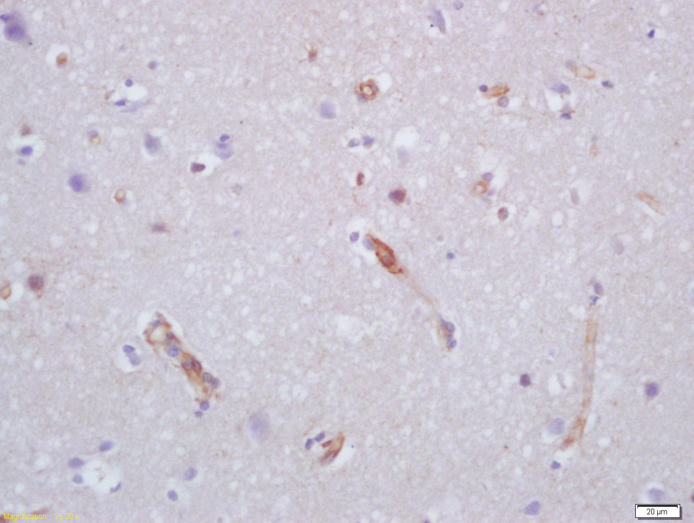 概述 别名 VEGF抗体;Vascuoar endothelial growth factor A; VEGF A; vascular endothelial growth factor A isoform 2 precursor; Vegf; VEGFA; MGC70609; MVCD1; VEGF; VPF; VEGFA_HUMAN; Vascular endothelial growth factor A; VEGF-A; Vascular permeability factor; VEGF A Precursor,VEGF宿主 Rabbit特异性 VEGF反应种属 Human预测反应种属 Dog, Pig, Cow, Horse, Rabbit, Sheep应用 WB: 1:500-2000, IHC-F: 1:100-500, IHC-P: 1:100-500, IF: 1:100-500, ELISA: 1:5000-10000分子量 Predicted molecular weight: 24kDa免疫原 KLH conjugated synthetic peptide derived from human VEGF(81-132/232)性能 形式 Liquid浓度 1mg/mL纯化方法 affinity purified by Protein A类型 Polyclonal Antibody克隆号 同种型 IgG储存/保存方法 Shipped at 4℃. Store at -20℃ for one year. Avoid repeated freeze/thaw cycles.存储溶液 0.01M TBS (pH7.4) with 1% BSA, 0.02% Proclin300 and 50% Glycerol.标记 Unlabeled修饰 Unmodified靶标 背景说明 Vascular endothelial growth factor (VEGF), originally known as vascular permeability factor (VPF), is a signal protein produced by cells that stimulates the formation of blood vessels. To be specific, VEGF is a sub-family of growth factors, the platelet-derived growth factor family of cystine-knot growth factors. They are important signaling proteins involved in both vasculogenesis (the de novo formation of the embryonic circulatory system) and angiogenesis (the growth of blood vessels from pre-existing vasculature).组织特异性 soform VEGF189, isoform VEGF165 and isoform VEGF121 are widely expressed. Isoform VEGF206 and isoform VEGF145 are not widely expressed.细胞定位 分泌型蛋白UniProt P15692研究领域 研究领域 CancerCancer MetabolismResponse to hypoxiaCardiovascularHypoxiaHypoxia-RegulatedMetabolismTypes of diseaseCancerMetabolismPathways and ProcessesMetabolism processesHypoxiaNeuroscienceDevelopment实验结果图Tissue/cell: human brain tissue; 4% Paraformaldehyde-fixed and paraffin-embedded;